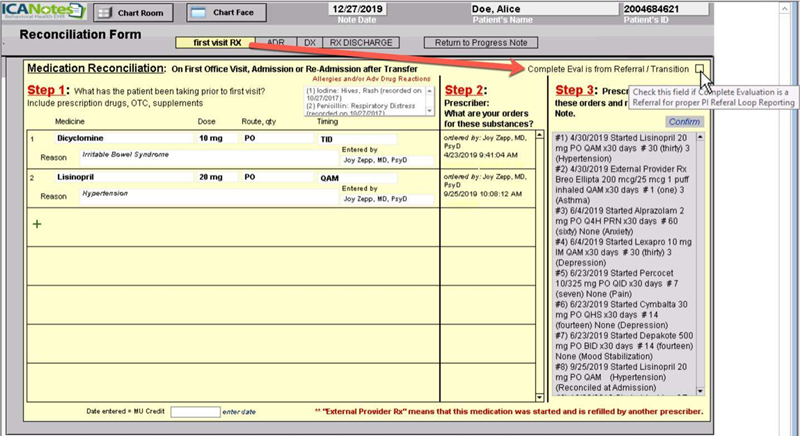 Numerator: The number of prescriptions in the denominator generated, queried for a drug formulary and transmitted electronically using CEHRT. This is automatically calculated by ICANotes.