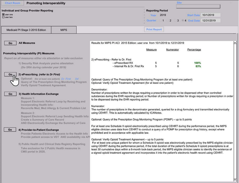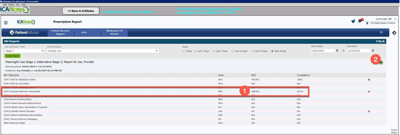 Numerator: The number of prescriptions in the denominator generated, queried for a drug formulary and transmitted electronically using CEHRT. This is automatically calculated by ICANotes.