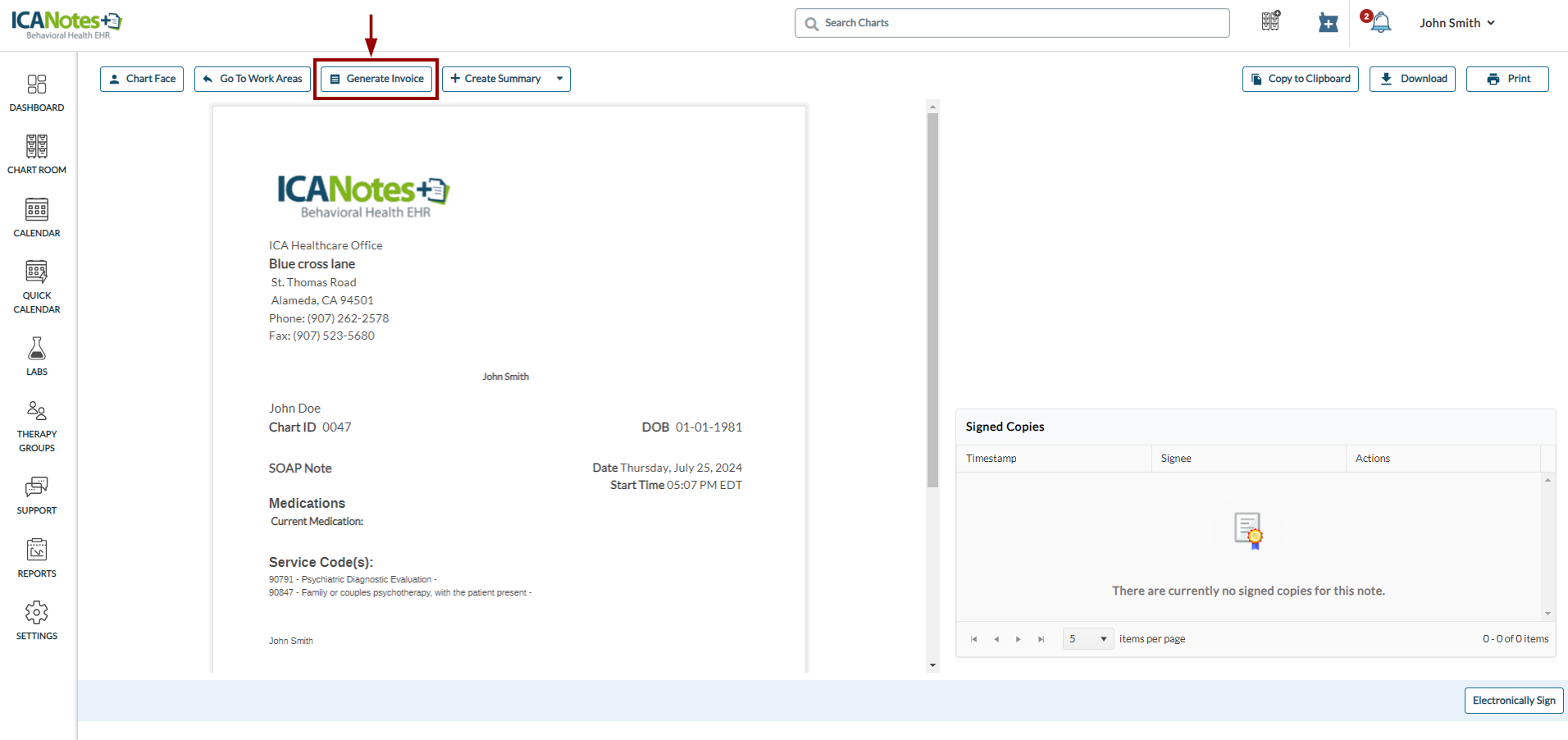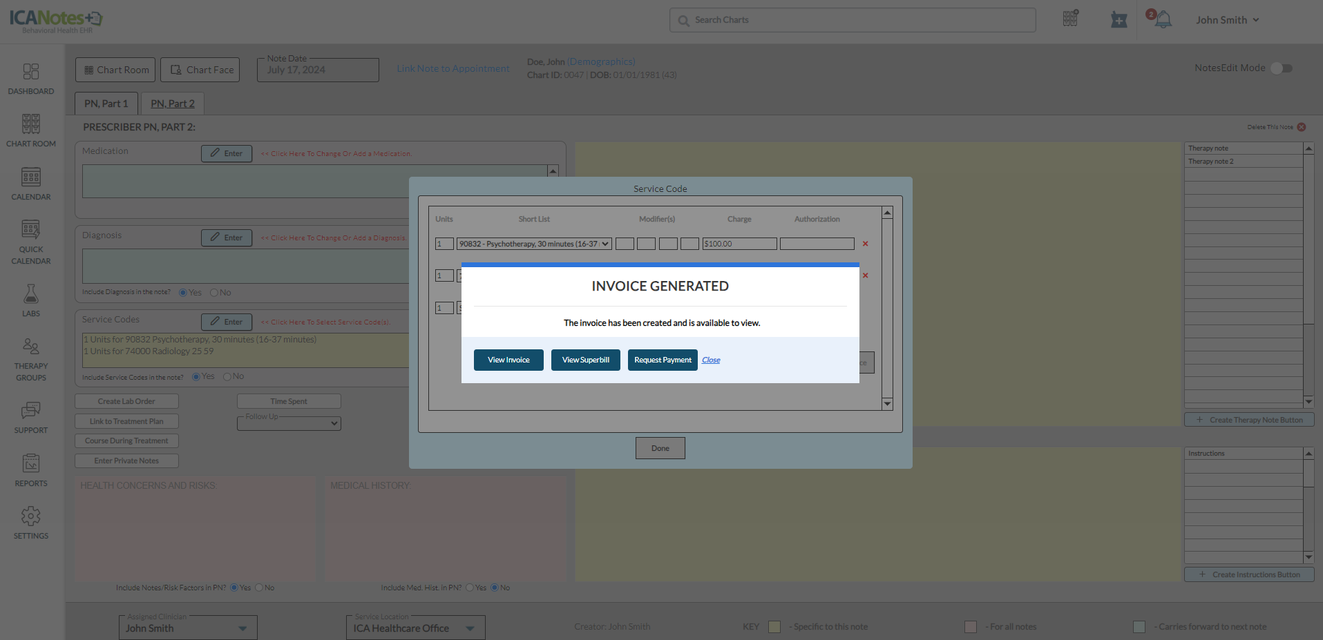 ICANotes+ provides several options for generating invoices. You can create an invoice from the following locations: