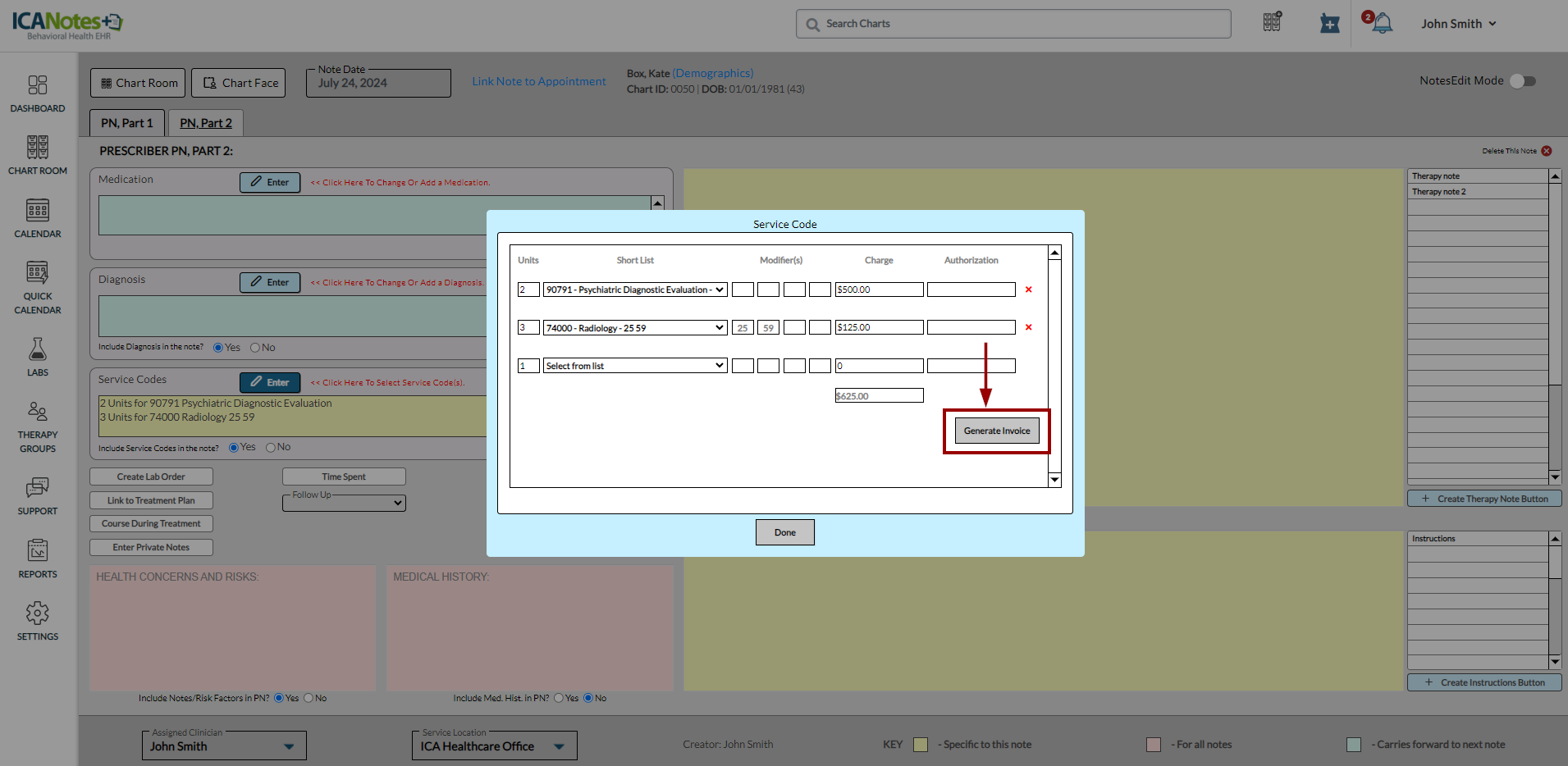 On the Service Codes screen, click the Generate Invoice button as shown below: