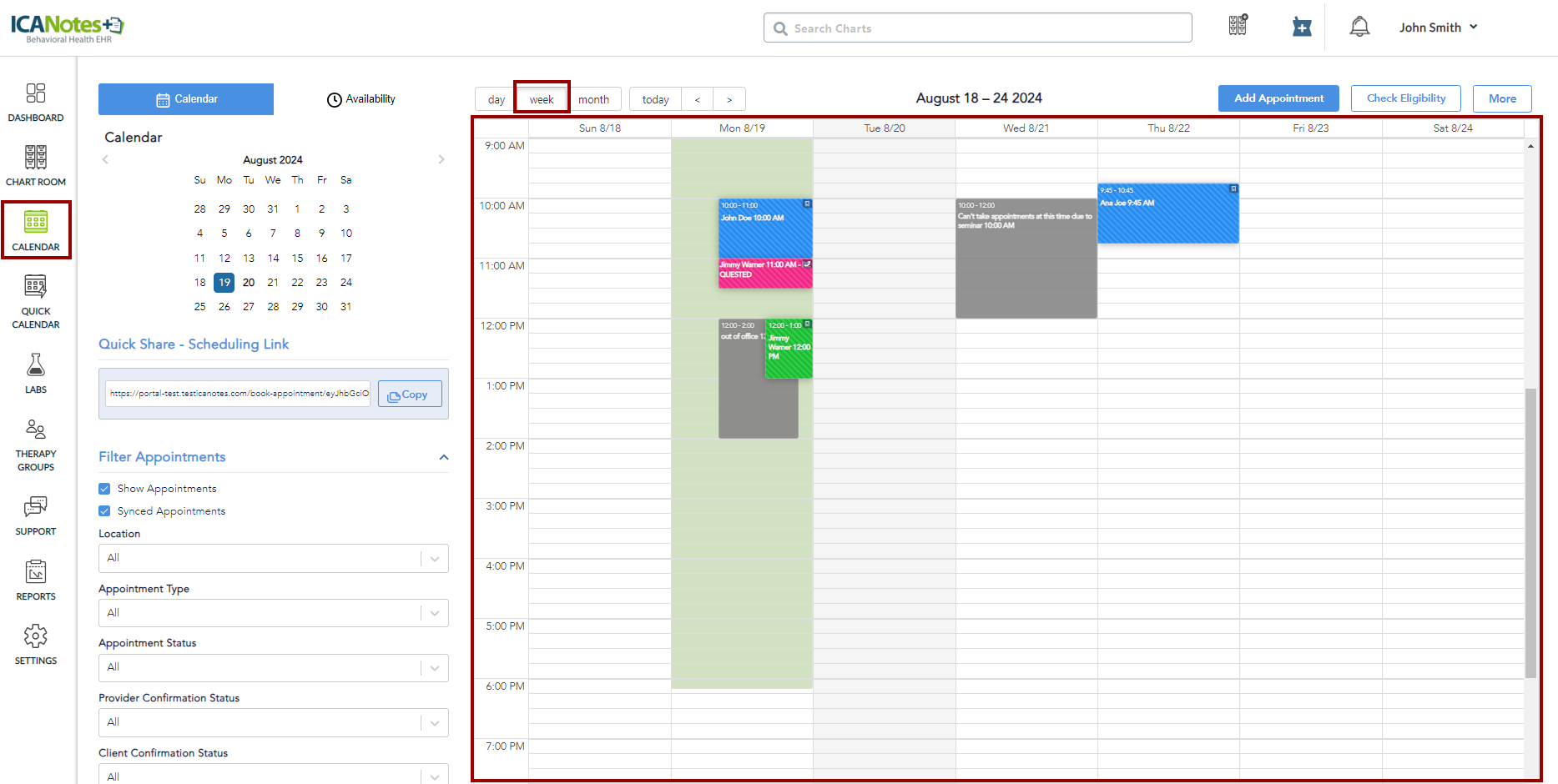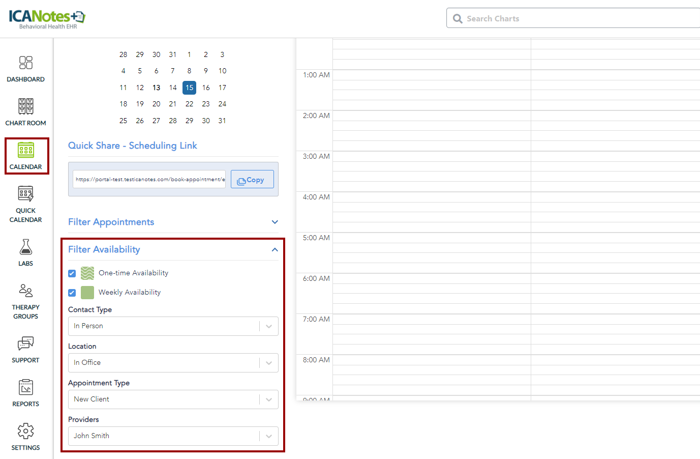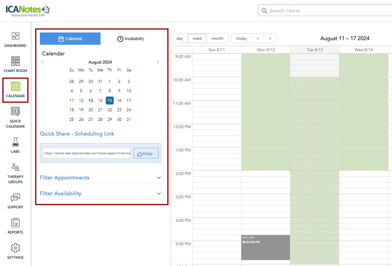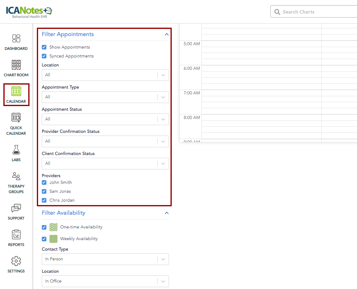 This knowledge base article provides a detailed guide on navigating the Calendar feature in ICANotes+. You will learn how to switch between the different calendar views (Day, Week, and Month) and understand how each view organizes and displays appointments. Additionally, the article covers the filter options available in the left pane, enabling you to customize your calendar display by viewing specific types of appointments based on locations, appointment types, appointment statuses, and providers.