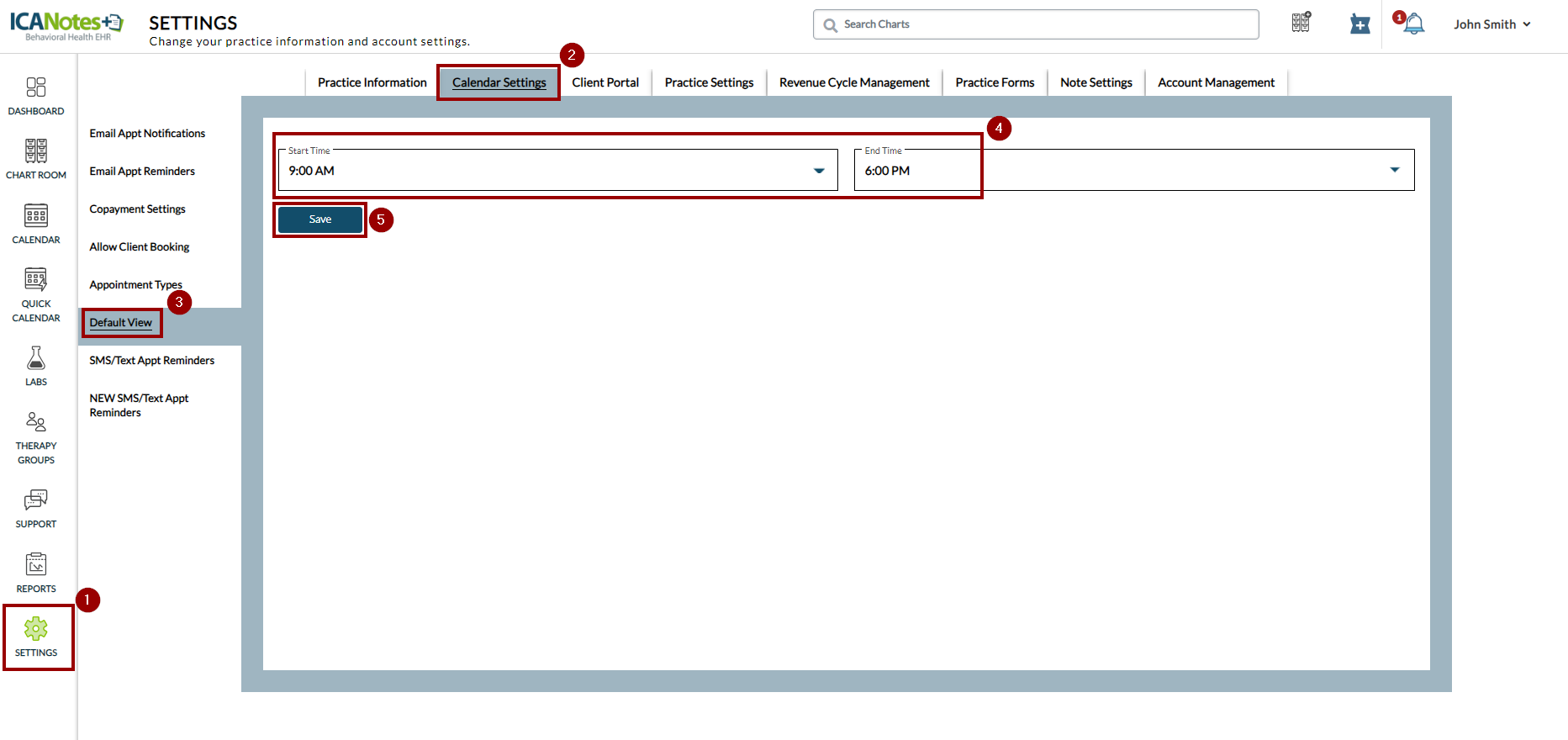 To set the default calendar view, go to Settings > Calendar Settings > Default View. Enter your desired start and end times, then click Save.