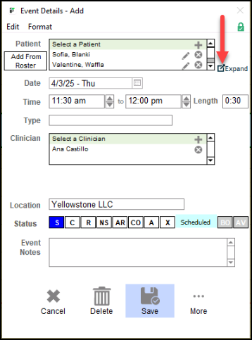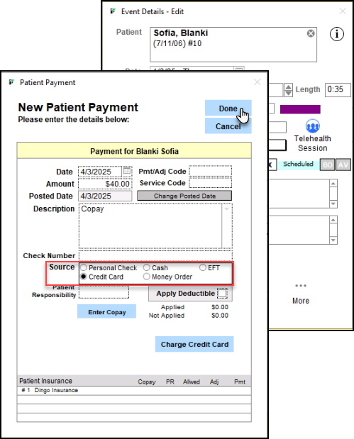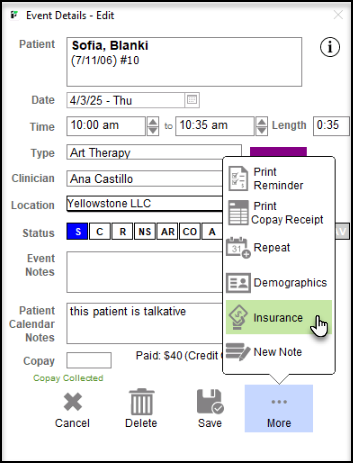 If creating an appointment for a patient on the telephone and the patient wants to update their insurance information, you can go to insurance by clicking the More button and then Insurance from the menu.
