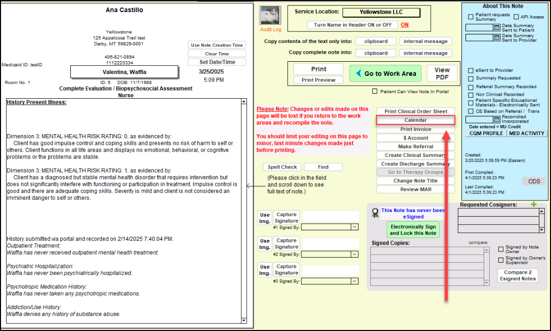 Once on the finished note screen, I can go back to the Calendar from the Calendar button.