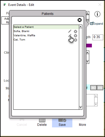 I can select a patient from the patient window by (a) clicking the magnifying glass and bringing up the find patient window. (b) Type in search criteria and search for the patient. (c) When you find the patient, click on his or her name and the patient will be shown on the calendar patient window.