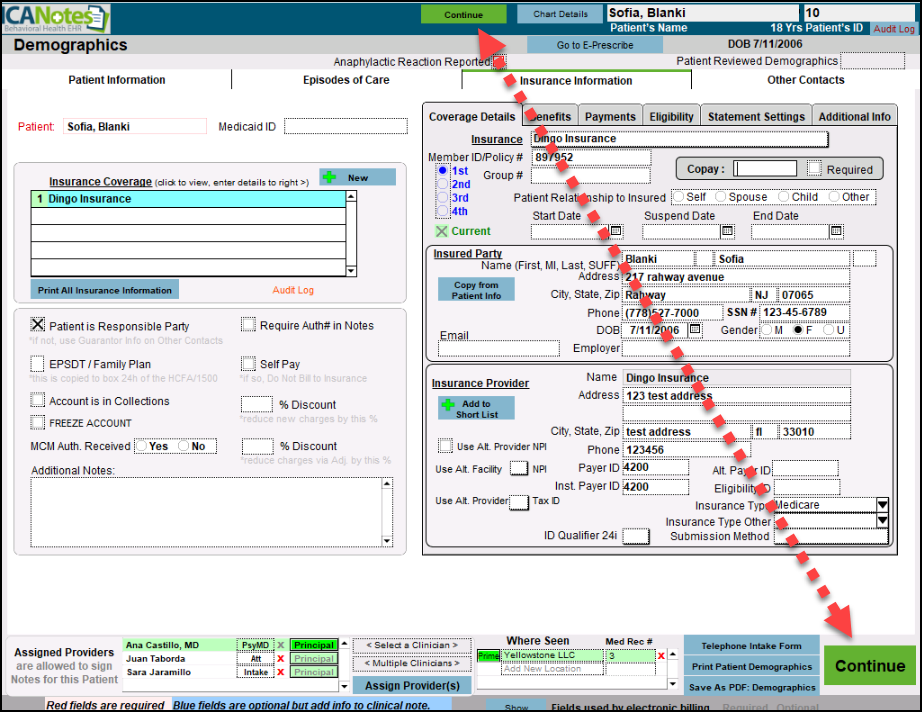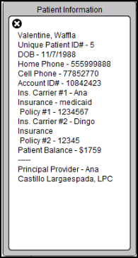 icon in the patient window. From here, I can see the ID number, DOB, phone numbers, insurance carrier, patient balance, and the principal provider. Click the