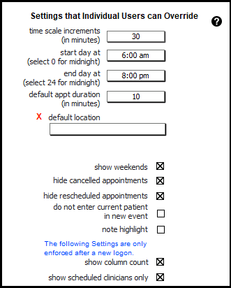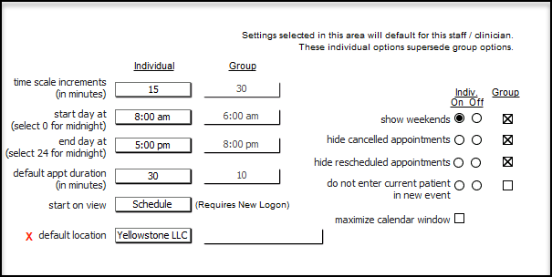 Here you can decide what to show on your calendar. The default group option will show, but individuals can override. The 'start on view' field is the type of calendar view you want to see when you go to the calendar.