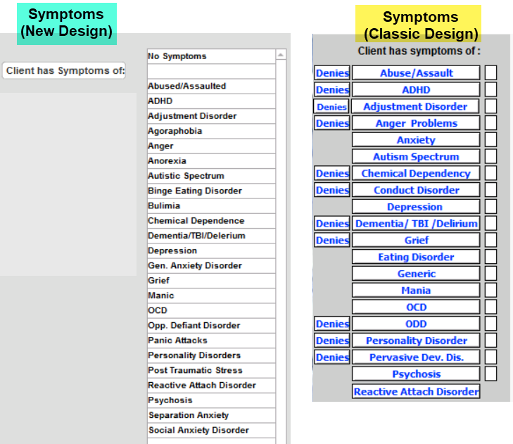 You will find all of the same content you're used to seeing in the classic version, in the new design. Some areas - such as Symptoms - have been rearranged for a more efficient workflow. Below is a side-by-side comparison showing the changes between Symptoms in the classic and new designs: