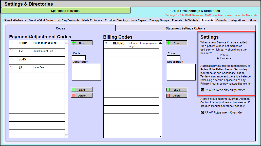 1. A Group Administrator can mark a code as Always Patient Responsibility. Go to the Group Level Settings & Directories and Service/Mod Codes tab. This will cause the charge to not go through an insurance payer and be the patient's responsibility to ...