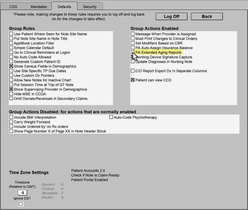 4. Go to the Defaults tab and enable the 'PA Extended Aging Reports.' Click Log Off button and log back on.