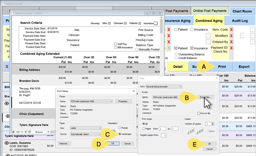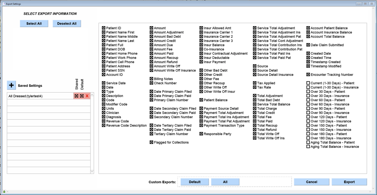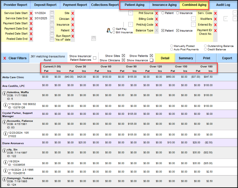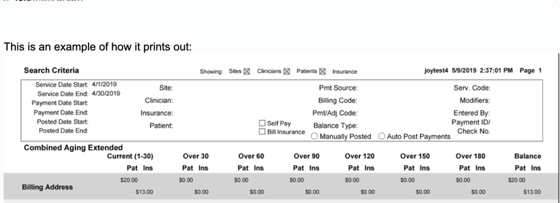 7. This report will work on all aging reports, but I used Combined Aging report as it shows a lot of information. This report shows the Current, Over 30, Over 60, Over 90, Over 120, Over 150, and Over 180. I also included Show Insurance/Patient Balances.