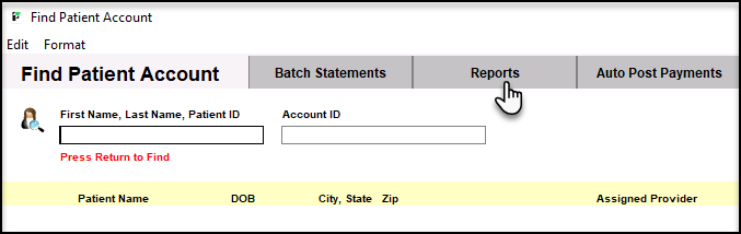 6. Click on the Report tab when the pop Find Patient Account window populates.