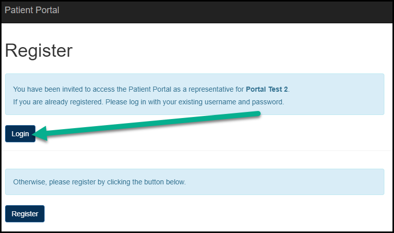 1. A portal owner can have access to multiple portal accounts. By clicking the registration link in their email, they will be brought to the Patient Portal Registration page. They will need to click