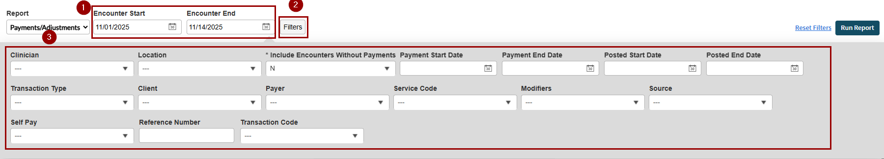 - Clinician: Choose a specific clinician to view payments or adjustments related only to that clinician. Leave blank to include all clinicians.