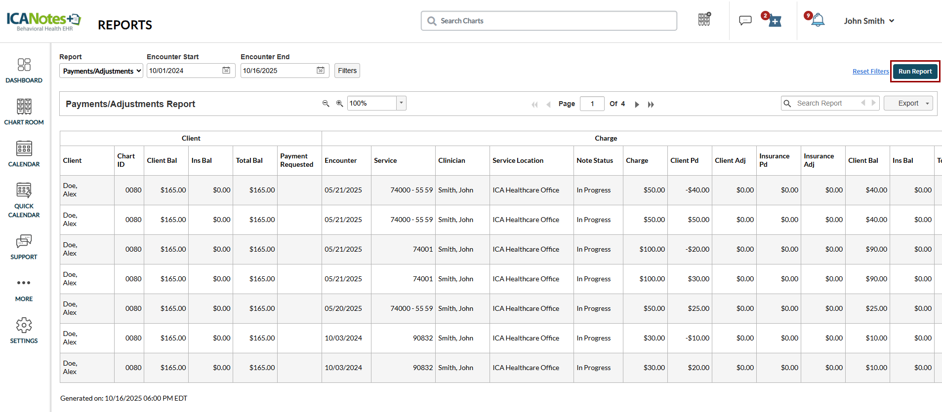 - Total Balance: Combined total of the client and insurance balances across all charges.