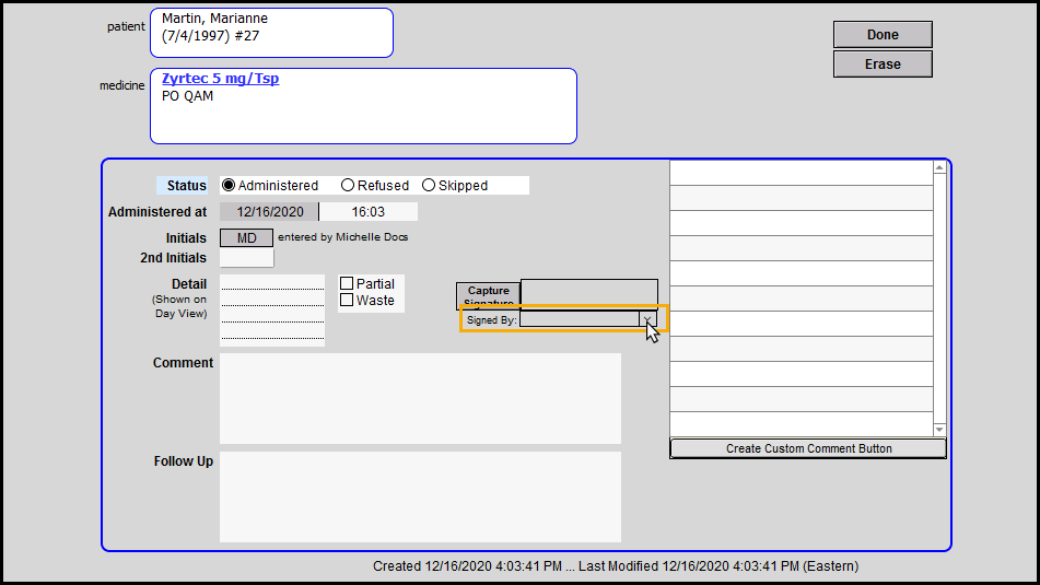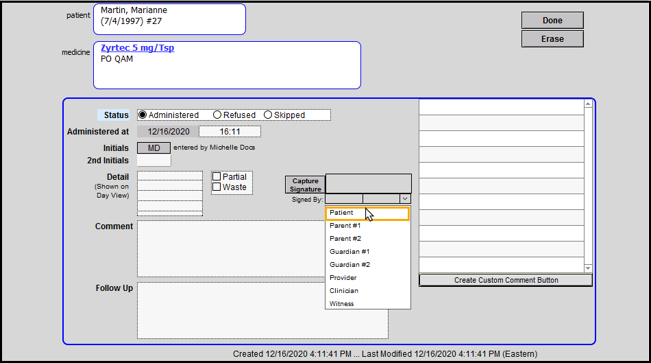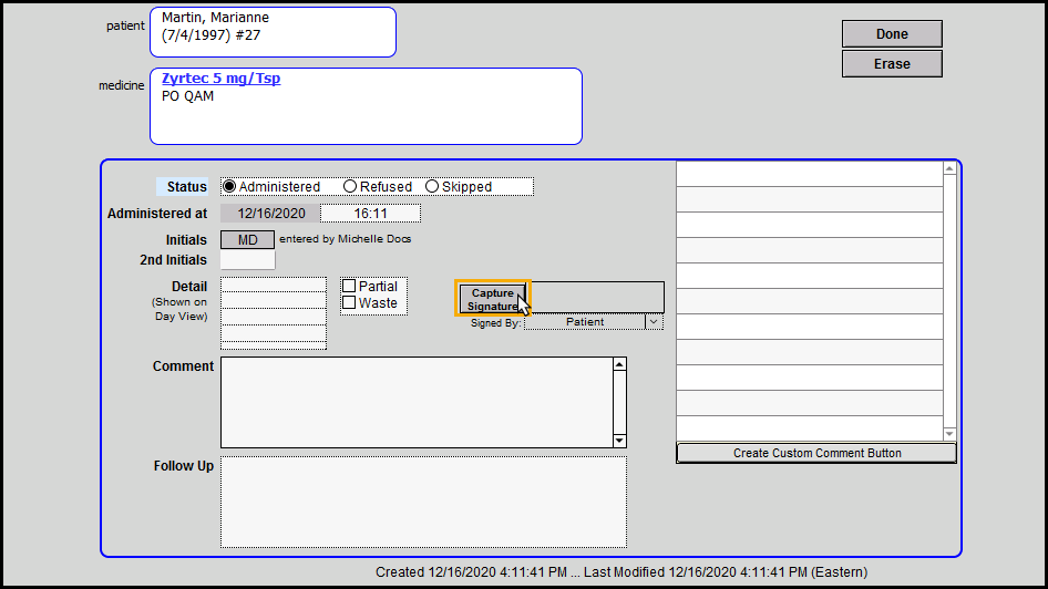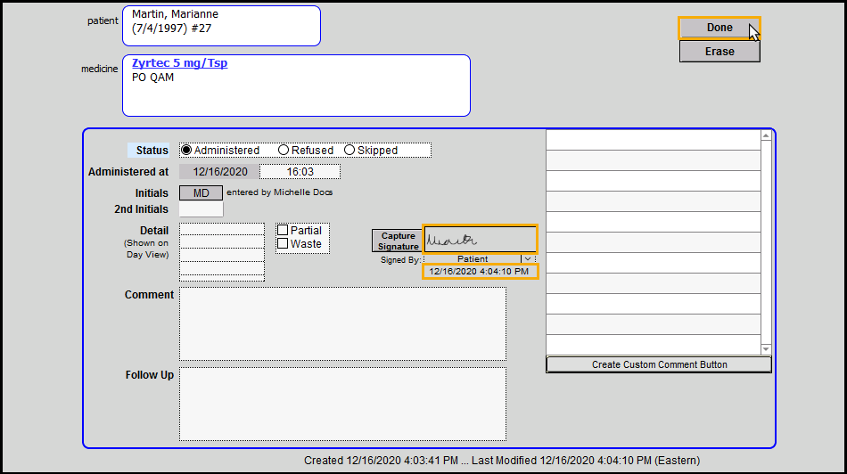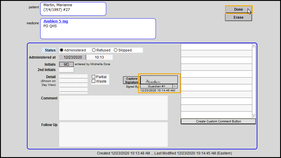The program will stamp the date and time the signature was collected and you will be able to see the signature. Click on Done to return to the MAR.