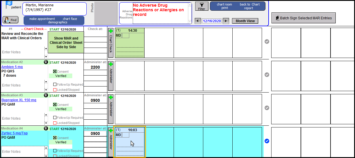 To sign for multiple medications at once, you can use the Batch Sign MAR Entries button at the top of the screen. Click on the check marks to select the MAR entries you want to include in the Batch. The checks will turn blue to indicate they are selected.