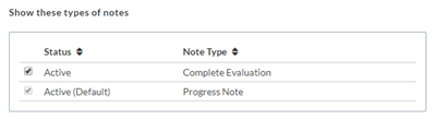 Individually manage whether each note type is active or disabled using the checkboxes located next to the Status of each note type.