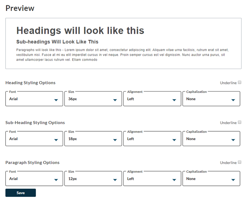 Use each dropdown field to set the font, size, alignment, and capitalization styling. As you make your selections, the preview window will display how your notes will appear in ICANotes.