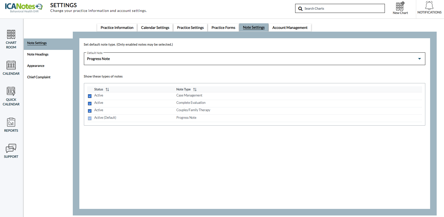 Click into the Note Settings section. Here you can modify Note Settings, Note Headings, Note Appearance, and Chief Complaint.
