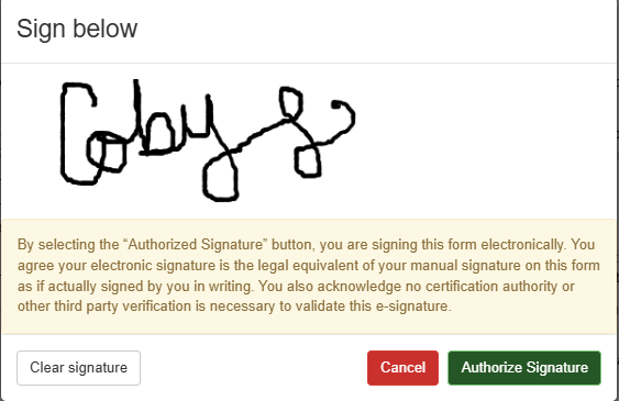 6. ‘Cancel’ will close the window, ‘Clear Signature’ will clear out the signature so you can try again, and ‘Authorize Signature’ will confirm the signature and add it to the form.