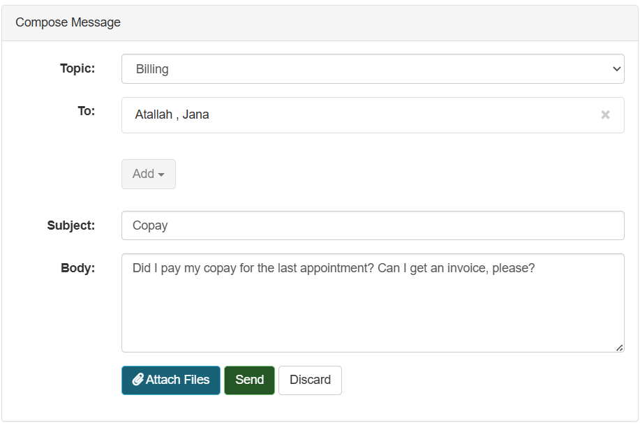 3. Compose your message, select your provider’s name using the dropdown arrow at the right of the To field, then click ‘Send’.