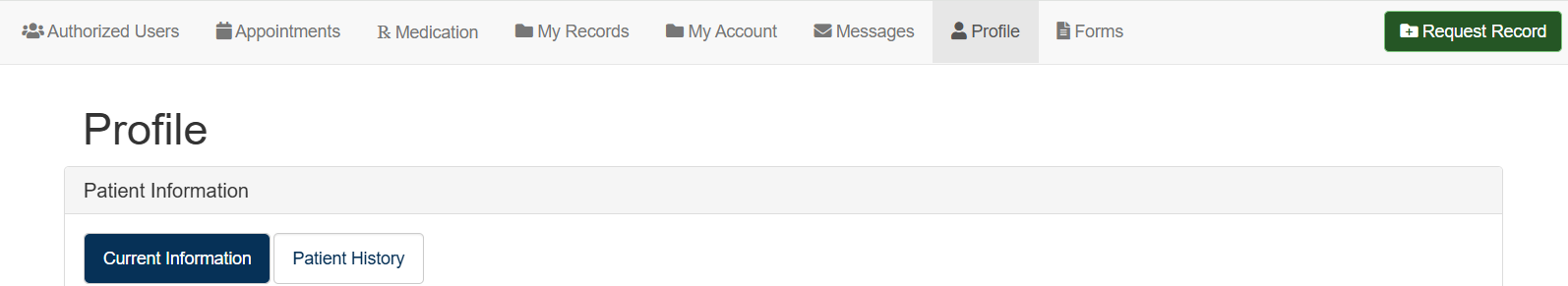 You have the ability to enter and make changes to demographic data on file at your provider’s office. Click the ‘Profile’ option on the top menu, the second-most option to the right hand side.