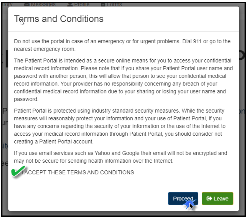 5. The first time you log in under your newly created Patient Portal Account, you will be prompted to accept the Terms and Conditions; click on the checkbox, then the ‘Proceed’ button to continue