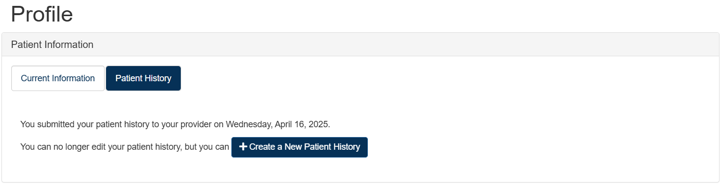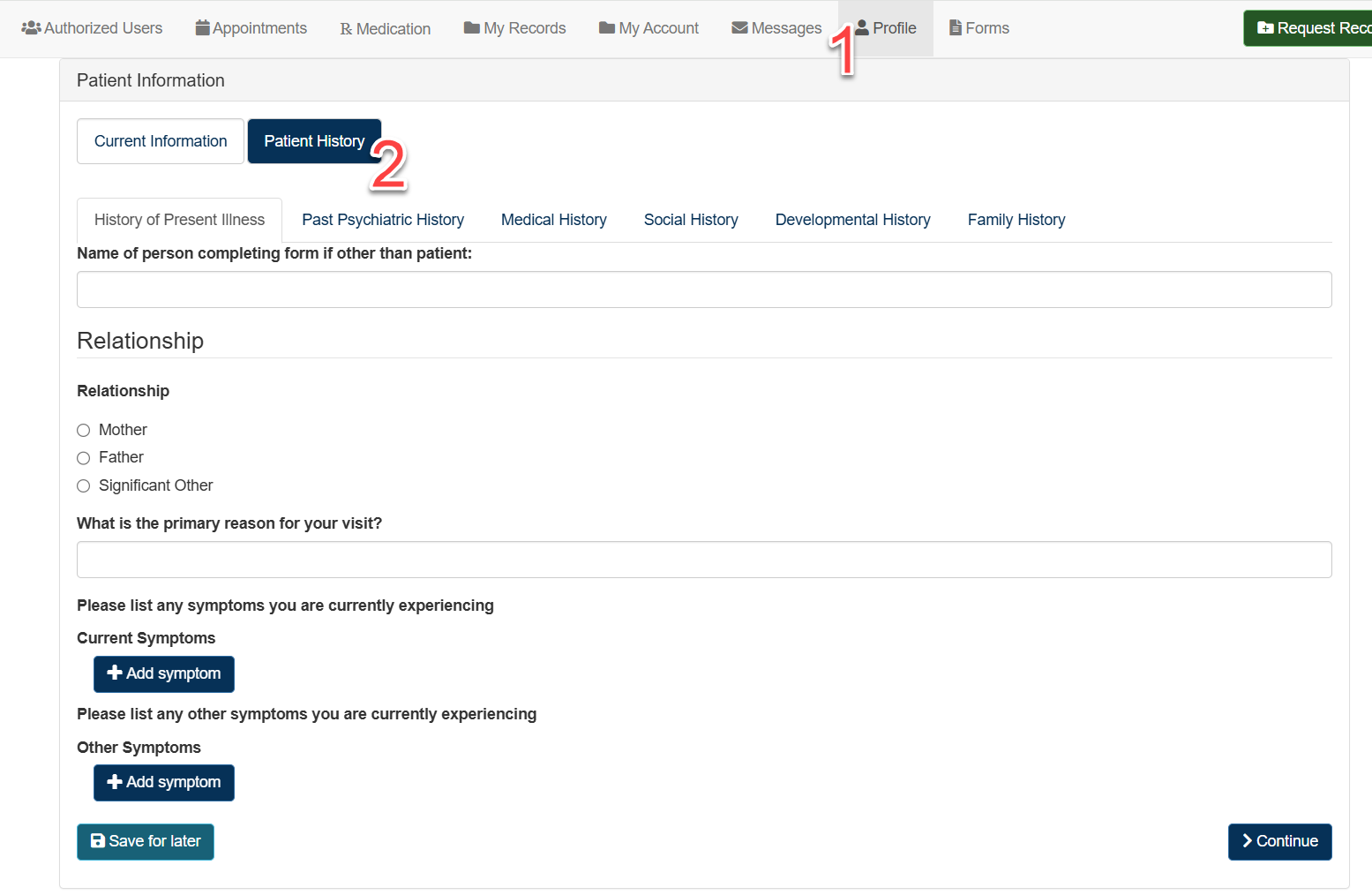 Patient History will bring you to an area you can fill out for your provider to provide a history of your current illness, past psychiatric and medical history, social and developmental history, and family history.