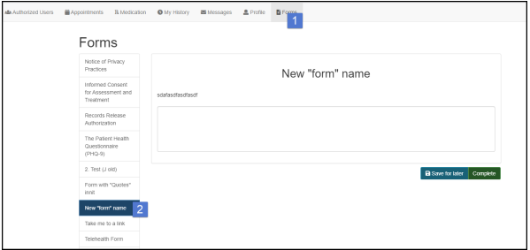 2. Sign into your patient portal and go to ‘Forms’ at the far-right of the top bar. 3. Find the form on the left side and select it.