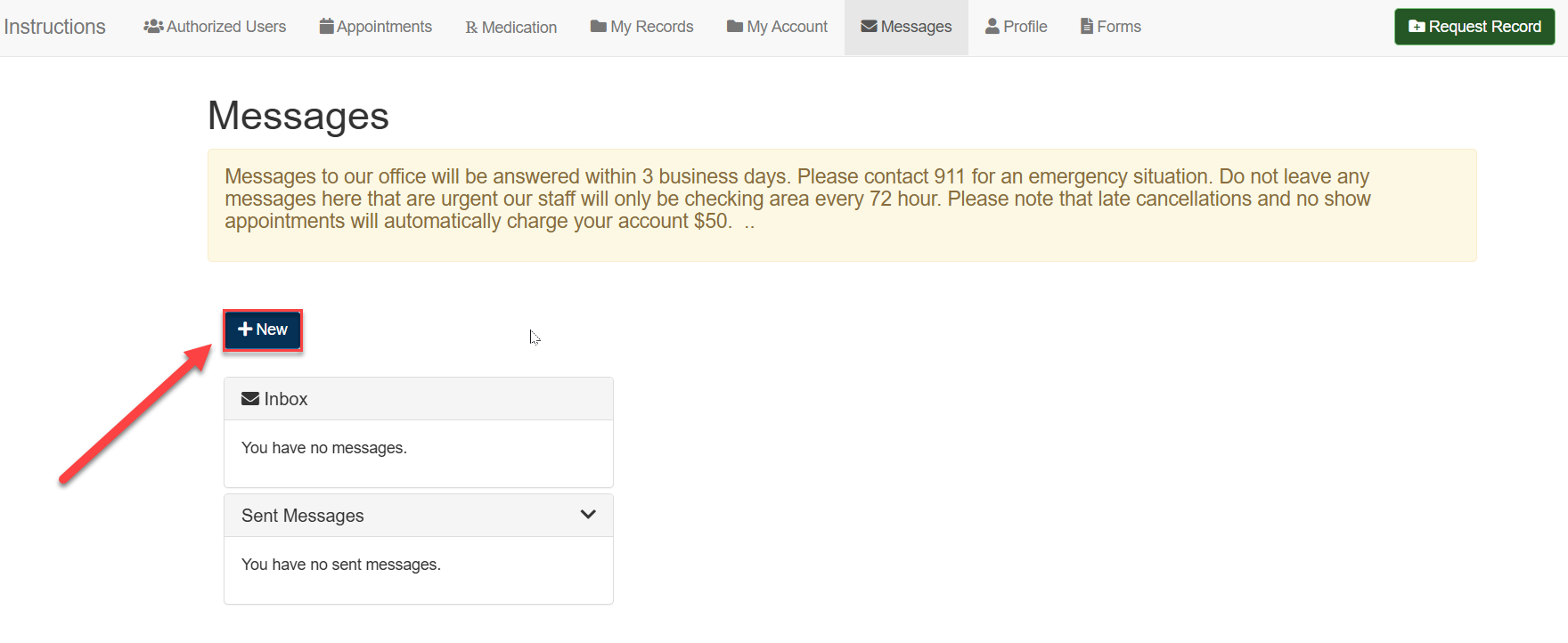 1. To send a secure message to your provider, click on ‘Messages’ in the top bar of the screen. Then click on the ‘New’ button.