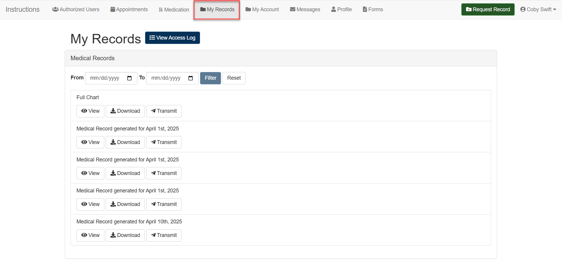 1. To access your Medical History, click on ‘My Records’ at the top of the screen; this will bring you to your Medical Records