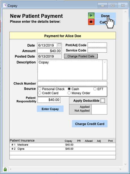 1. For this to work, you need to make sure the patient has a copay requirement, which can be setup in the Insurance Information tab of Demographics. 2. From the Calendar, you will be able to see that the patient has a required copay from the red $ ...