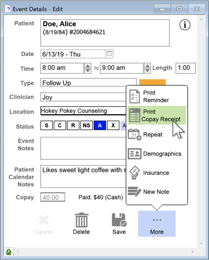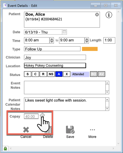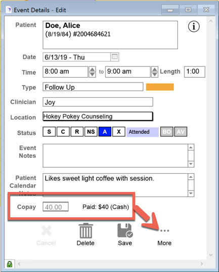 1. For this to work, you need to make sure the patient has a copay requirement, which can be setup in the Insurance Information tab of Demographics. Suggested: Turn on 'add $ before name on appt with patients who have copay'. 2. From the Calendar, ...