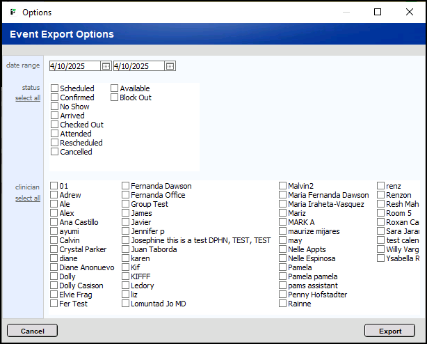 2. Choose the date range. For this example, I am printing one day, 12/13/2018. Choose the status and clinicians that you want to print.