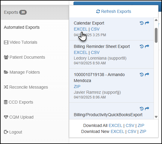 6. On the left side, click the Exports link and then choose the report to export.