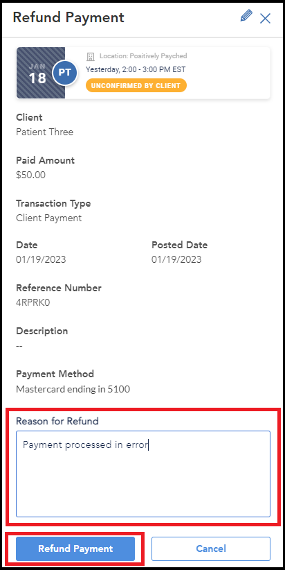 The Refund Payment window will display the original payment details. Partial refunds are not possible at this time. The total paid amount will be refunded. Populate the Reason for Refund field and select Refund Payment at the bottom.