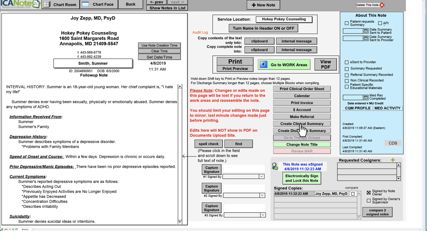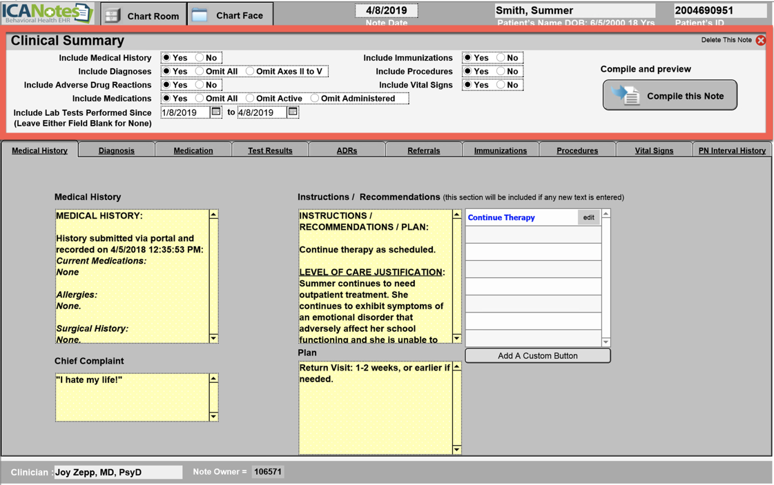 On the Clinical Summary, fill out the top fields to indicate what you would like included. This summary will have all fields filled out. Compile the note when ready.