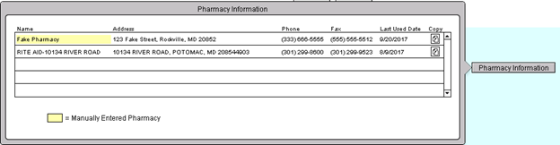 ICANotes will help identify manually entered pharmacies within the Medication Entry window when in the Work Areas or a prescriber note. Clicking the "Pharmacy Information" button will expand a popover to display the patient's previously used pharmacies through e-Prescribing. Any pharmacies highlighted in yellow are identified with a high probability of having been manually entered.