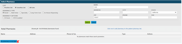 Prescriptions sent to manually added pharmacies will trigger an automatic fax transmission. If you are having trouble finding a pharmacy that you know to exist simply use the first letter of the pharmacy name and the zip code as your search criteria. Refrain from adding new pharmacies to your practice list.
