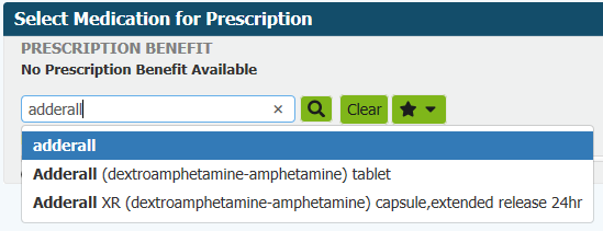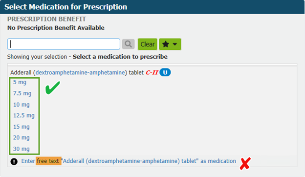 Always select medications presented to you as choices rather than the free text options that are permitted. All free text medications will trigger an automatic fax transmission. When creating a new prescription, as you type in the name of the drug you will see available options from the database to pick from. Select one of the available options first