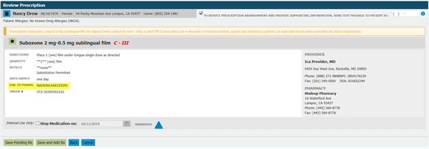 In the Review Prescription window, the NADEAN will be visible in Dir. To Pharm. (Directions to Pharmacist), highlighted in yellow below: