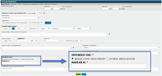 Complete the prescription as usual, type in the NADEAN number, then when ready, click to Review your prescription.
