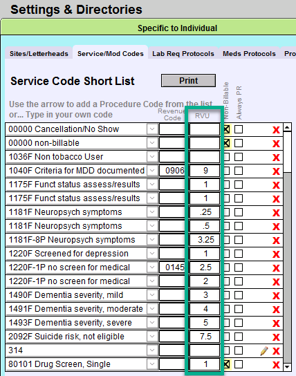 Navigate to Service/Mod Codes in group level Settings and Directories to see the RVU column added to the Service Code Short List.