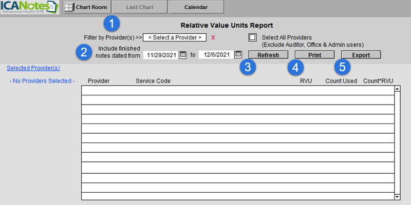 ICANotes offers a workflow for setting Relative Value Units for service codes, then tracking of those units used in the Relative Value Units report, visible to users with RVU Admin access enabled from the Security Center.