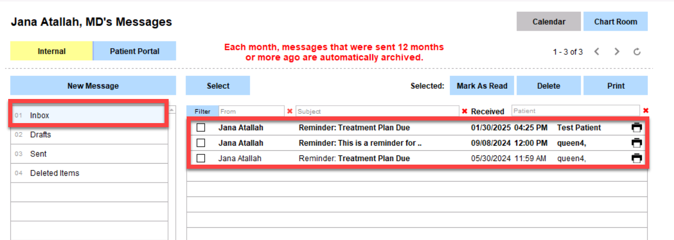 2. When the date of the reminder arrives, you will see the message in your inbox.