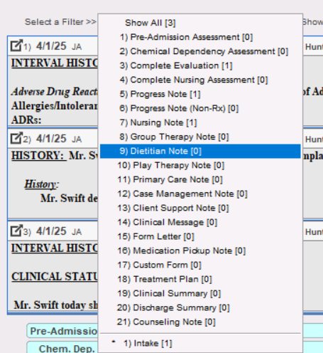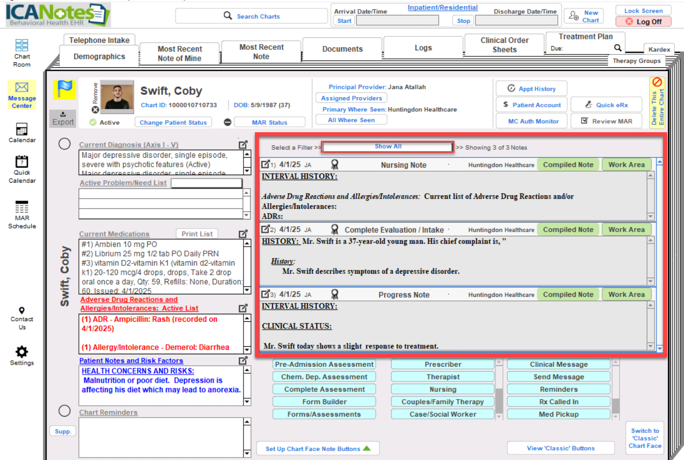 On the main patient Chart Face, you will find a list of all of the notes, evaluations, form letters, custom forms and other documents that have been created in ICANotes for this patient, going in reverse chronological order (newest listed first), on the right-hand side.