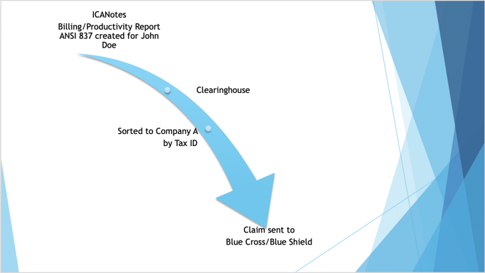 For example, John Doe is seen by Company A. He has Blue Cross/Blue Shield as his insurance. His ANSI 837 is prepared from the Billing/Productivity Report in ICANotes and sent to clearinghouse, Waystar. Waystar looks at the ANSI 837, sorts the claim under Company A’s Roll-Up account, and sends the bill to Blue Cross/Blue Shield.
