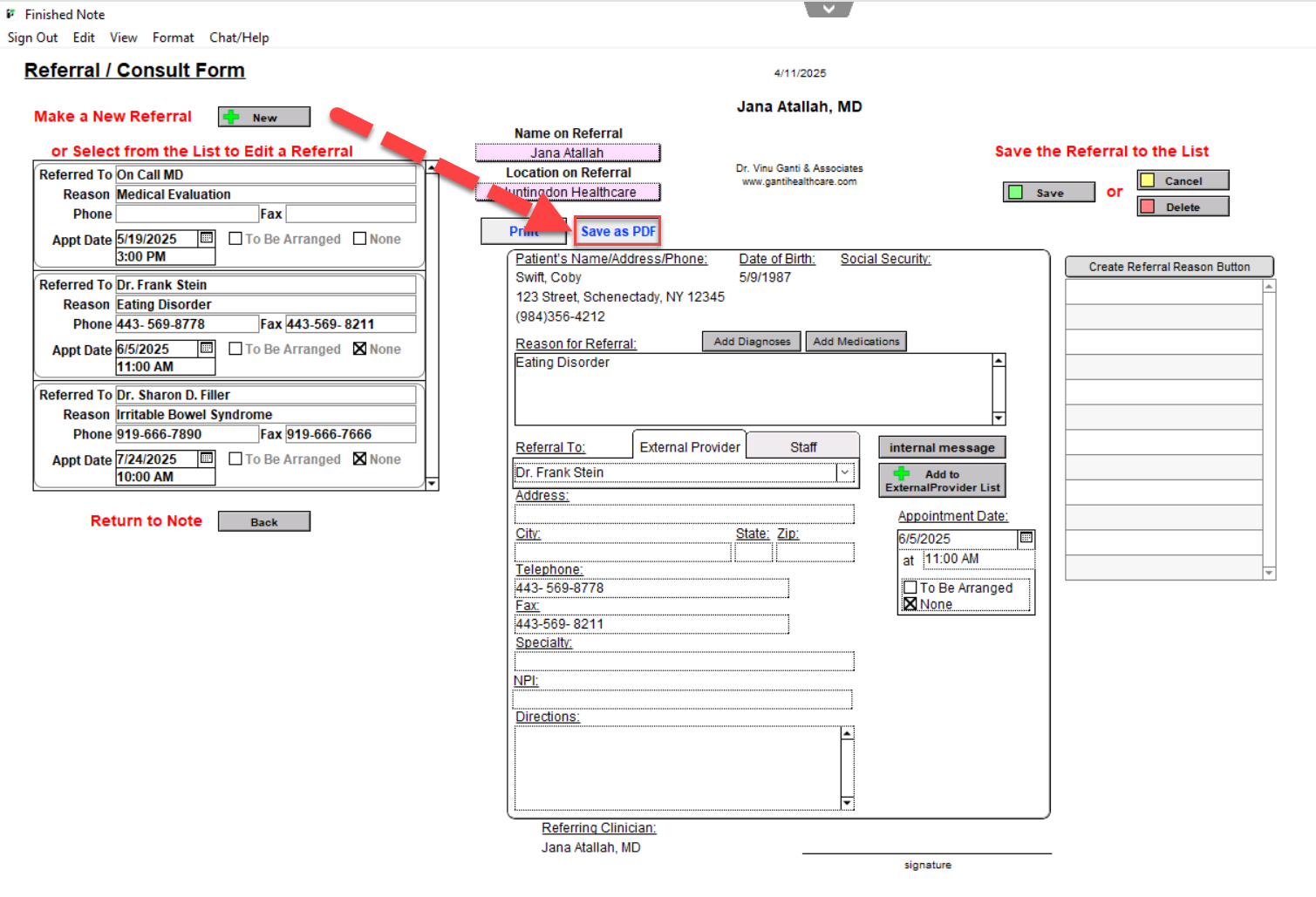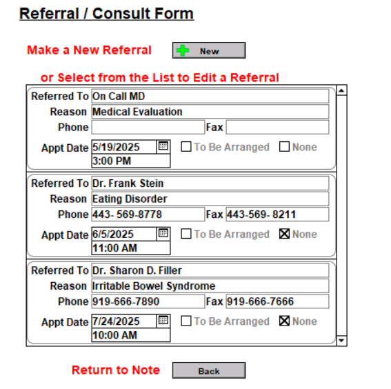 1. In the Referral/Consult Form area, choose/click an existing referral to pull up (or create a new one and save it).