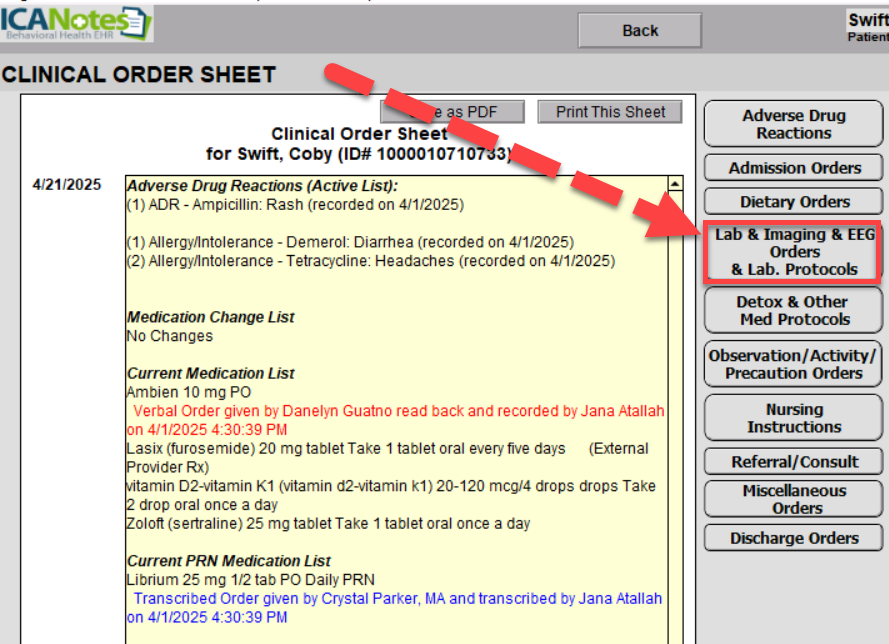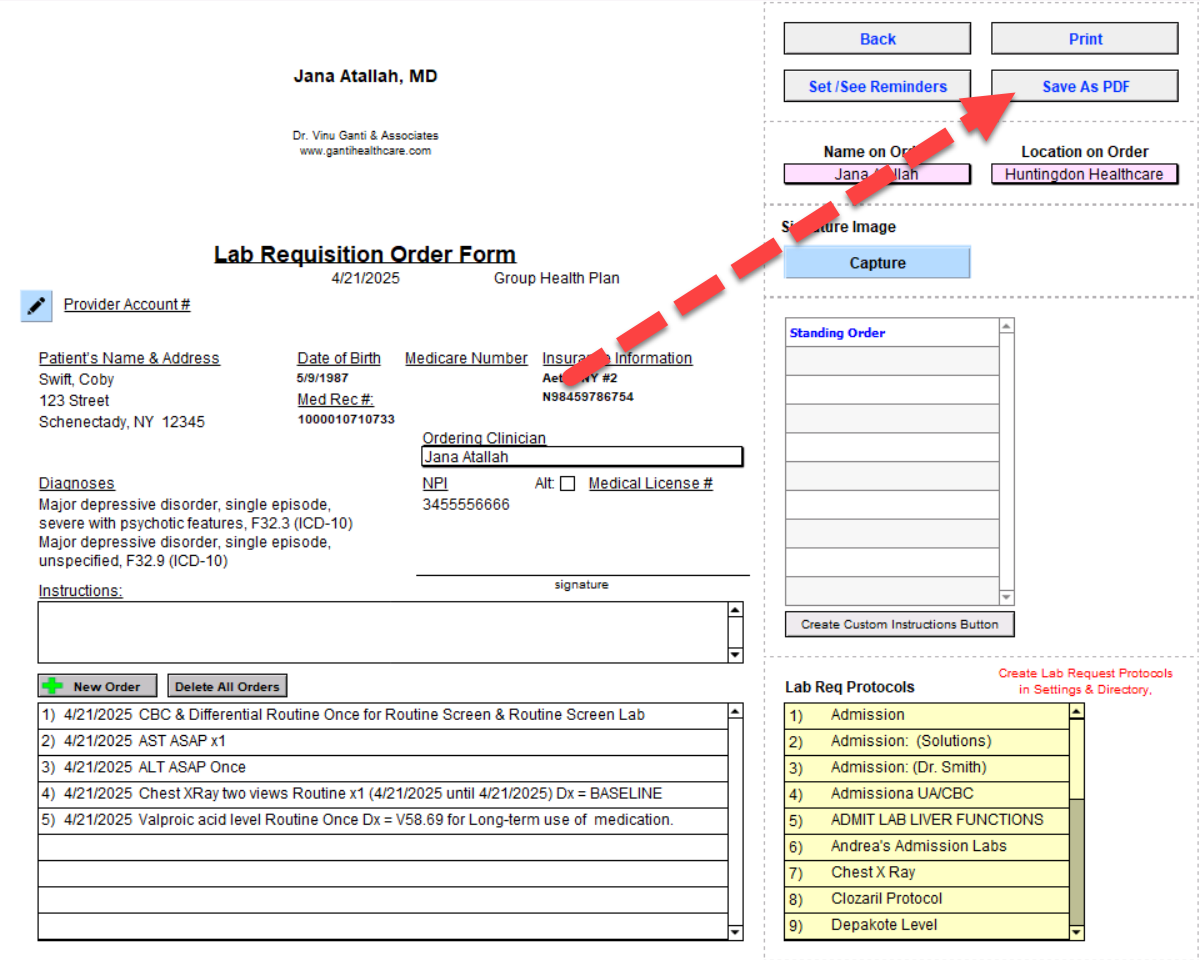 2. After the lab orders have been created. You are able to save all to PDF by clicking the Save As PDF button.